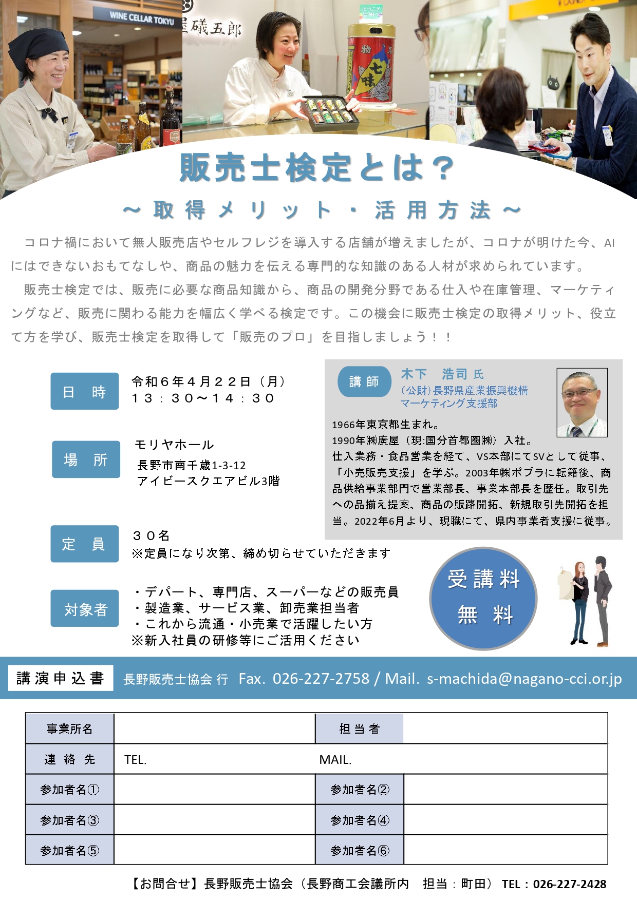 長野販売士協会はこのほど、市内のホールでリテールマーケティング(販売士)検定の普及・受験数拡大などを目的にセミナー「販売士検定とは?」を開催した。セミナーには、地元のデパート、専門店、スーパーなどの担当者ら約20人が参加。販売に必要な商品知識から、仕入や在庫管理、マーケティングなど、販売に関わる能力を幅広く学べるリテールマーケティング(販売士)検定の概要、取得メリット、活用方法などを分かりやすく解説した。参加者からは、「販売以外のさまざまな分野でも役立つ」「お客様に与えられるサービスの質が変わる」「雇いスタッフのレベルの標準化が図れる」「取引先の開拓・選定から、仕入・販売まで全てのプロセスで活用できそう」などの声が寄せられた。