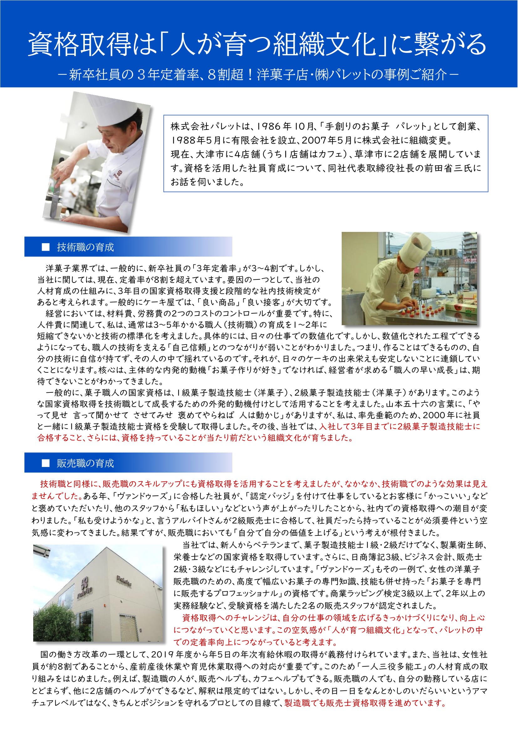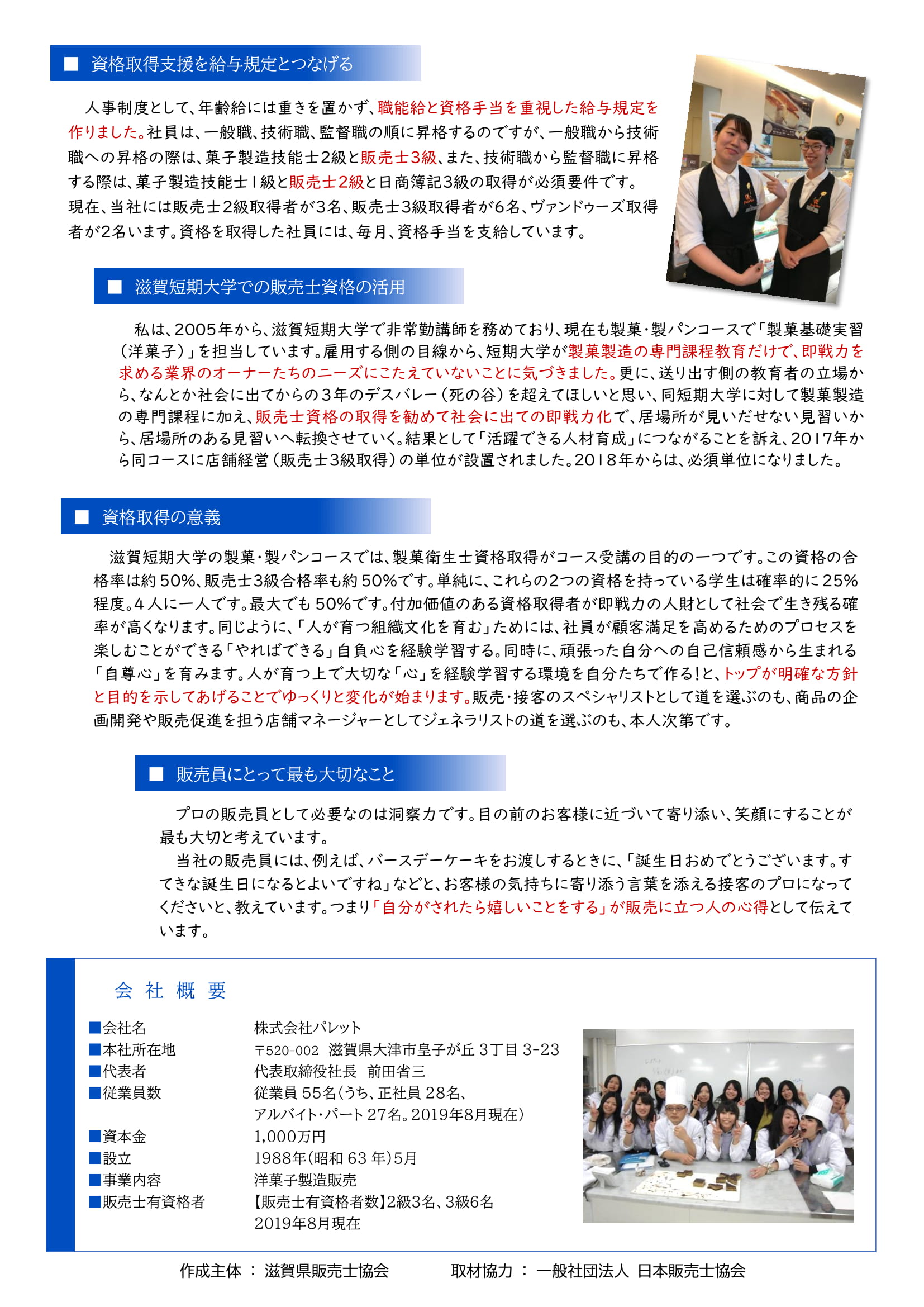 滋賀県販売士協会は、このたび、会員企業である株式会社パレット(滋賀県大津市)が、販売士を含む資格を人材育成に活用している取り組みを事例としてまとめたリーフレットを作成しました。同協会では、販売士資格を企業経営に活かすためのヒントとして提示し、あわせて、同協会への理解促進につなげるため、同リーフレットを、同協会の案内パンフレットとセットにして配布する予定です。